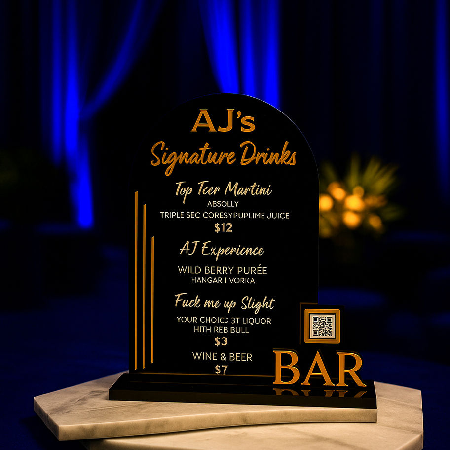 Featuring a built-in QR code display, your guests can instantly scan to view the full drink menu, signature cocktails, or even drink tickets—all without cluttering the design.