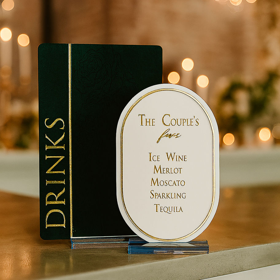 Crafted with precision and layered detailing, The Signature Sip is ideal for couples who want a polished drink display without the need for custom design work. The layout remains fixed—ensuring a consistent, high-end aesthetic—while the text and color palette are fully customizable to match your event's style and menu.